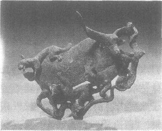 | 释义 | 三兽噬牛铜扣饰西汉。高8厘米,宽12.4厘米。云南省晋宁石寨山出土。云南省博物馆藏。扣饰表现的是,一头壮硕的牛被三只小兽和一条长蛇缠住进行厮斗的情形。牛的前肢扬起,一条巨蛇用尾部死死缠住巨大的牛角,弯曲的身体践于牛及小兽足下,它曲颈张口胶住牛的后腿,一只小兽攀住牛臀,抱住牛尾,张嘴欲咬,却又不知从何下口,另两只小兽均在牛腹下,一支咬牛腹,一只咬牛腿。一场以大战小,以众取寡的战斗似刚开始不久,究竟谁胜谁负?器作者将这一思考留给了观者。