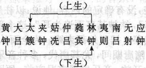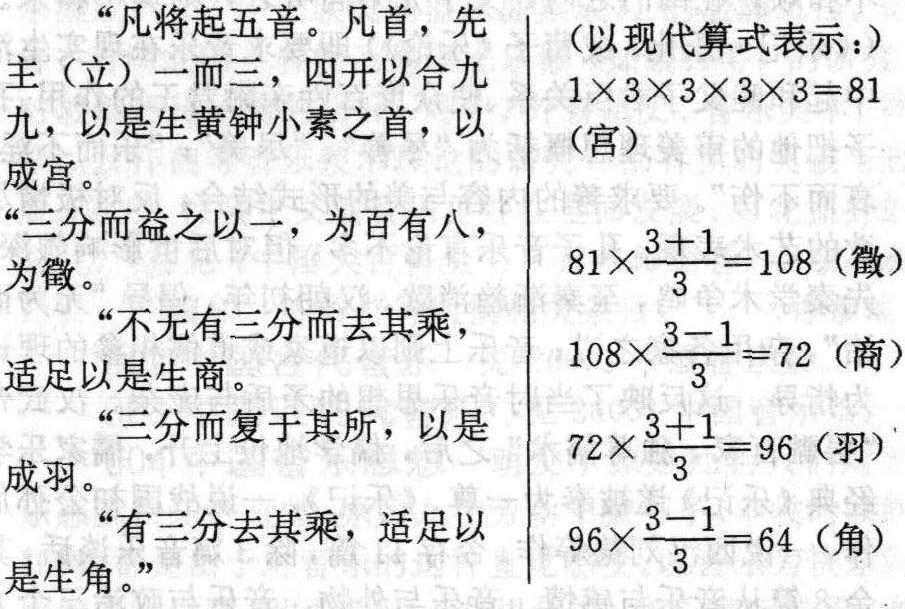 此法是设一段弦长代表某音(如宫),由此出发,以每次所得之数,依次乘以3+1/1(三分之,而益其一)或3-1/3(三分之,而损其一),得出五音,恰与五声音阶相合,又是古代十二律之最初五律。至《吕氏春秋·音律》篇,始将此法归纳为“黄钟生林钟;林钟生太簇……”,五度相生 (也称“隔八相生”),并求得十二律: