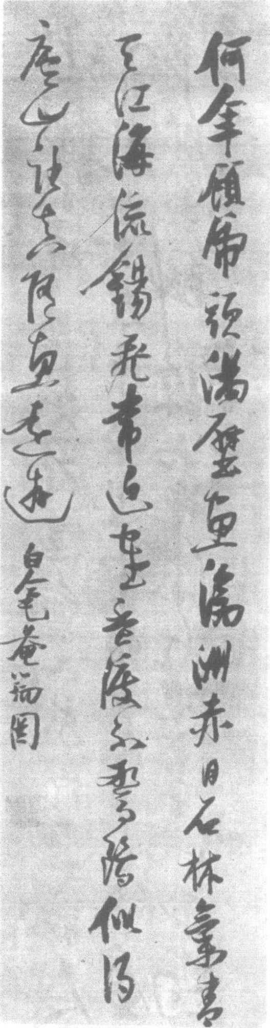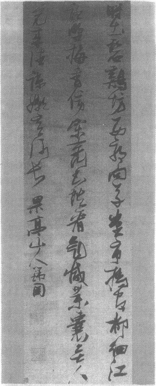 张瑞图行草书五言律诗轴明。绫本。纵189.5厘米,横55.5厘米。江西省博物馆藏。张瑞图(见《张瑞图草书杜甫诗卷》条目)书。五言律诗:“时出碧鸡坊,西郊向草堂,市桥官柳细,江路野梅香,傍架齐书帙,看题减乐囊,无人觉来往,疏嫩意何长。”款署“果亭山人瑞图”。款下钤白文:<张瑞图印>朱文<大学士章>两印。左下钤朱文<方其道所藏金石书画>收藏印。书体纵横铺排,气势雄伟,刚劲奔放,布局和谐。结构以横取势,笔锋时中时侧,灵动飞舞,既有娴熟的笔法,又有古拙的姿态,给观者展现了一个典雅洒脱的艺术欣赏空间。