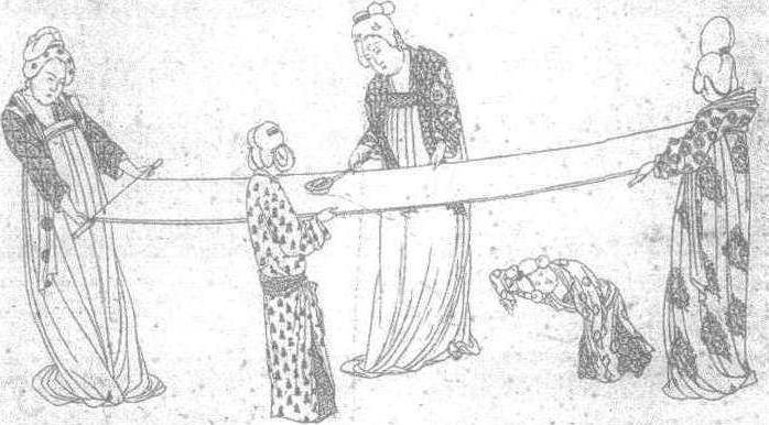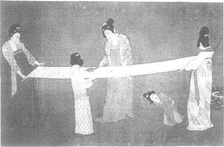 | 释义 | 张萱《捣练图》长卷,绢本,设色。此图描绘了宫中妇女加工白练的过程。“练”是丝织品的一种、织成时质地硬,须煮熟后再用杵捣柔软,然后熨平使用。全卷人物分三组,分别表现了捣练、织修、熨烫的劳动情景。开卷一组四个妇人中三人执杵捣练,另一个人扭身挽袖,把观者视线引到第二组: 一妇女坐在毡席上,双手伸开路线,另一妇女坐在对面,织修白练,一女童正挥扇煽炉中的火炭。第三组中的四个妇人中,两人对立拉直白练,一人在中间托练,一人执熨斗熨烫。一个小女童钻到了白练底下,躬背仰首向上观望。张萱非常善于捕捉劳动中的微小细节。比如那煽火炭的女童,身体向后仰向外转,似乎是在躲避炭火的烟灰; 那配合熨烫的妇女,由于用力拉直白练,身体重心向后,上身后仰,动态极为生动。还有那仰首上观的女孩,不但把小孩天真好奇的情态表现了出来,也使得滞板的劳动情景增添了活跃的气氛,使整个画面张弛有度,富有生活情趣。
