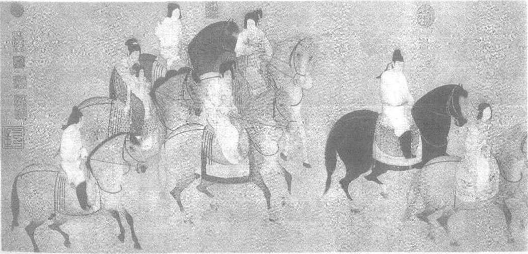| 释义 | 张萱《虢国夫人游春图》长卷,绢本,设色。此图描绘的是唐玄宗的宠妃杨玉环的三姐虢国夫人及其眷从出游的情景。全卷共描绘了八匹马、九个人。前三骑和后三骑是侍从、侍女、保姆。中间的两骑,居于右上的是秦国夫人,侧身向左,正在与虢国夫人述说着什么。虢国夫人仪态端庄,悠然自得。她们身后的一匹马上,一保姆拥着 一女童。孩童被描绘成比例缩小的 “小大人”,体现出当时绘画还存在一定幼稚之处。画卷构图疏朗,节奏轻松。前三骑空疏,后五骑紧凑,错落自然有致。人物表情悠闲慵懒; 马儿步态轻松欢快,紧扣了 “游春” 的主题。其背景处以润笔染出一片蒙胧的草色,使观者领略到了春日郊外的清新和空旷。