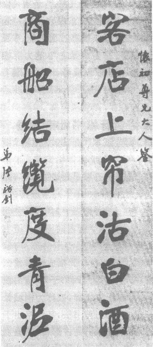| 释义 | 张裕钊行楷书杜甫诗轴清。泥金纸本。纵139.5厘米,横49厘米。湖北省博物馆藏。张裕钊(清道光三年—光绪二十年,即公元1823—1894年)。字廉卿,湖北武昌人。道光二十六年,即公元1846年举人,官内阁中书,历主江宁、保定、武昌等地书院。与黎庶昌、吴汝纶、薛福成师事曾国藩,人称“曾门四弟子”。澹泊独行,笃志于古文辞,被称为桐城派末期之胜流。善书法,其体格出于碑而不伤于帖,高古浑穆,用墨别具一格,为康有为所称道,其书法影响极大。《广艺舟双楫》云:“廉卿书高古浑穆,点画转折,皆绝痕迹,而得态逋峭特甚,其神韵皆晋、宋得意处。”近人马宗霍《霋岳楼笔谈》云:“廉卿书劲洁清拔,信能化北碑为己用。饱墨沉光,精气内敛,自是咸同间一家。”著有《今文尚书考证》、《濂亭文集》等。《清史稿》卷四百八十六有传。释文:“西岳凌竦处尊,千峰罗立如儿孙,安得仙人九节杖,拄到玉女洗头盆。车箱入谷无归路,箭括通天有一门,稍待西风凉冷后,高寻白帝间真源。去岁并展拱御床,五更三点入骞行,欲知趋走伤心地,正想氛氲满眼香。”款署“丙戌春日书,寿亭尊兄大人属,廉卿张裕剑。”此书写于1886年,时张氏63岁,笔法率真,于方见圆,提顿转折劲洁清挺,章法布局严谨规整,从而可以窥见其精湛、独特的功力。