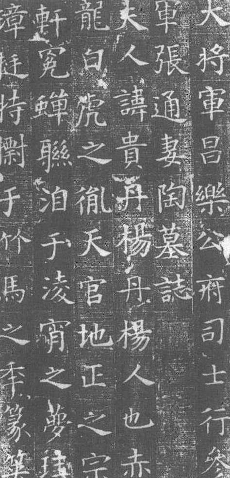 | 释义 | 张通妻陶贵墓志隋。刻石。开皇十七年(即公元597年)立。楷书。高36.6厘米,宽36.2厘米。近世于陕西省西安出土。曾归张伯英。现藏于陕西省西安碑林。墓主陶贵,丹杨人,富商张通之妻,开皇十七年(即公元597年)三月卒,年55岁,于当月廿六日葬于长安县龙首乡。此碑亦称《大将军昌乐公府司士行参军张通妻陶贵墓志》。碑文共19行,行19字。有方界格。书从字体到布局上都齐整端庄,于隋代墓志中属于一派书风。拓本很多,北京故宫博物馆藏有其旧拓本。黄本骥《古志石华续编》、赵万里《汉魏六朝墓志集释》等有著录。