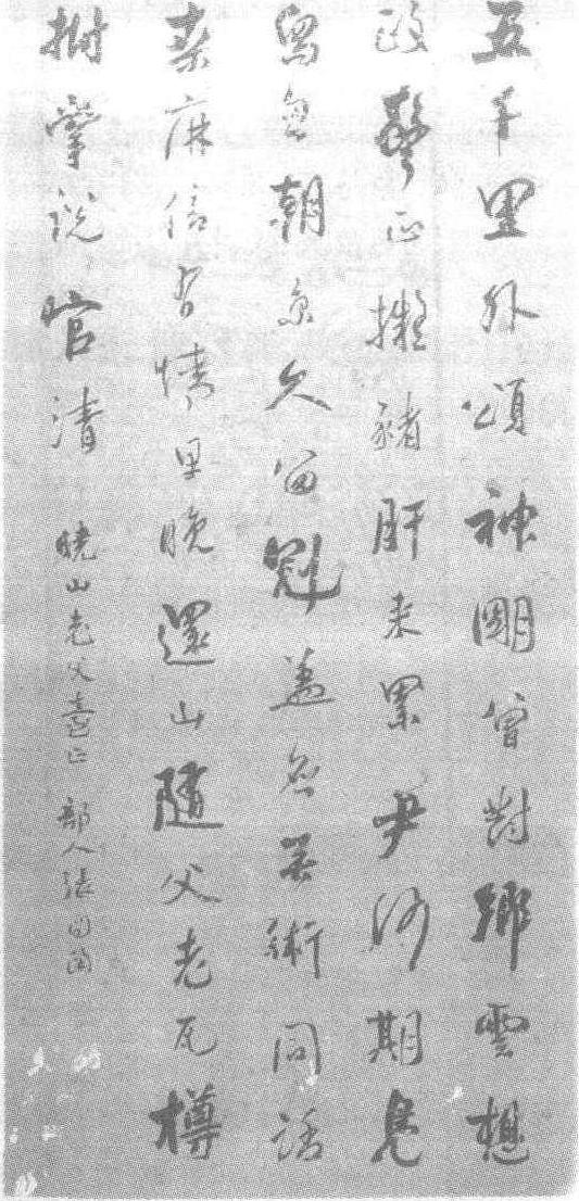 | 释义 | 张问陶行书七言律诗轴清。纸本。纵120厘米,横55.5厘米。四川省博物馆藏。张问陶(见《张问陶行书七言诗轴》条目)书。此幅七言律诗:“五千里外颂神明,曾对乡云想政声,正拟猪肝来累尹,何期凫舄忽朝京。久留冠盖应无术,同话桑麻倍有情,早晚还山随父老,瓦樽拊掌说官清。”下款署:“晓山老父台正部人张问陶”。款下钤朱文:〈张问陶印〉、〈船山〉两印。书体险劲、雄壮,结体宽博端庄而不拘谨,用笔遒劲敦厚,自然而富于变化,字与字左右顾盼,行与行气脉贯通,有清新活泼、生气盎然之感。