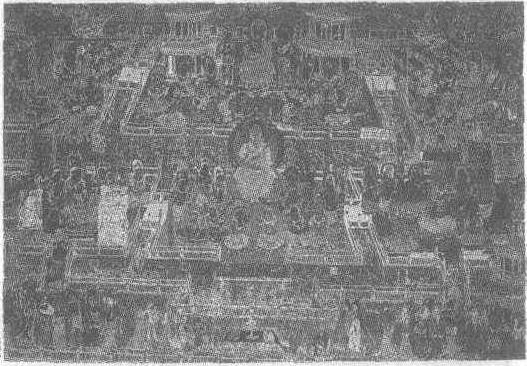 | 释义 | 弥勒经变图(局部)壁画初唐。纵336厘米,横485厘米,甘肃省敦煌县莫高窟第329窟北壁西侧壁画。弥勒共有三会,每次法会皆能渡脱大量众生。此图的中部,即主体部分的初会,上层的东西两侧为第二、三会。此为画面上层中所表现的一会。图中宝台被宝池环绕,琉璃为地。弥勒坐于龙华树下的莲座之上,着通肩红色袈裟,内穿僧祗支,正在说法。周围圣众虔诚听法,蓝天上画幡飘扬,诸佛乘云赴会。此图设色浓艳,人物描绘细腻,宗教色彩十分浓厚。