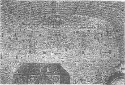 | 释义 | 弥勒经变壁画盛唐。纵200厘米,横310厘米。甘肃省敦煌县莫高窟第148窟南壁上层壁画。上壁为兜率陀天宫,楼阁、亭台、回廊相连。在左右对称的两组建筑之间,弥勒菩萨正在说法,有从众、菩萨、天人围绕。画面的中下部为下生经变。佛陀居中,佛前有儴佉王、太子天色、王妃、婆罗门、大臣、长者等,是弥勒佛初会说法场面。西侧和东侧分绘一组菩萨、天王、力士等,表现的是第二会说法和第三会说法。下部画弥勒下生经变中各种情节的内容,如儴佉王的故事,一种七收,树上生衣,嫁聚,龙王夜间降雨等情节。整个画面内容丰富,层次分明,构图对称整齐,赋彩艳丽,是盛唐时期最大的弥勒经变壁画。