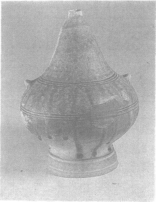 | 释义 | 弦纹硬陶匏壶汉。高27厘米,口径2.1厘米。广东省广州龙山岗出土。北京中国历史博物馆藏。此种器口极小的壶形似匏瓜状,故名称即由此而得。壶长颈,自上而下越来越粗,鼓腹,腹下部内收,高圈足。肩部饰两个环形耳。壶身有凹弦纹3组。器身上部施黄褐色釉,有流釉现象。壶下部及圈足露胎,胎质坚硬细密。此种硬陶在南方多有烧造,而这种造型奇特的陶壶多在广东的汉墓中发现。