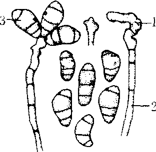 弯孢属 1.“之”字形弯曲 2.分生孢子梗 3.分生孢子 |