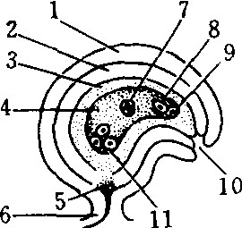 弯生胚珠 1.外珠被 2. 内珠被 3. 珠心 4.胚囊 5. 合点 6. 珠柄 7. 极核 8. 卵细胞 9. 助细胞 10. 珠孔 11. 反足细胞 |