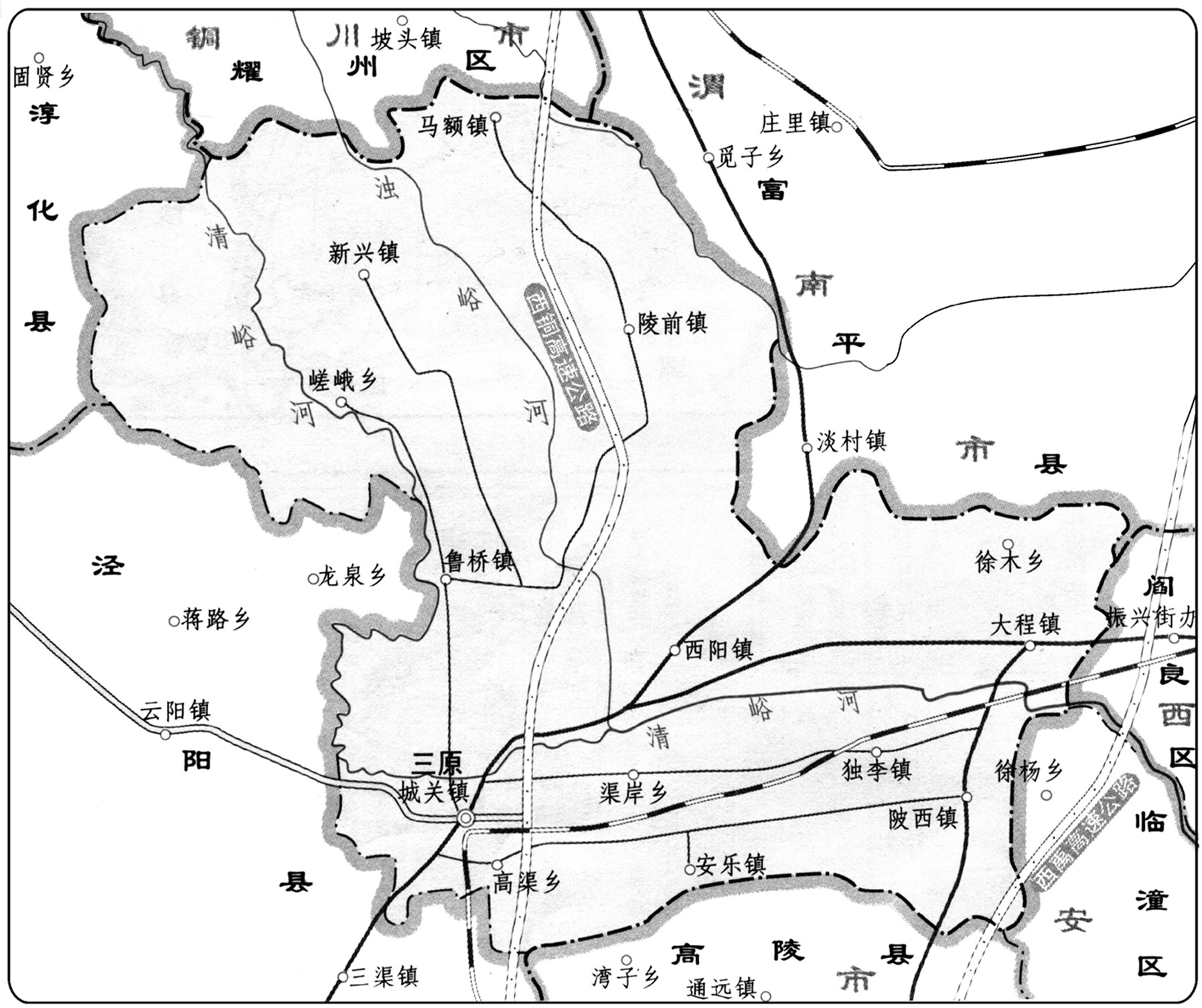 咸阳市辖县。位于市区东北部35公里处。东临富平县和临潼县,南接高陵县,北连耀县,西与淳化县和泾阳县毗邻。面积569平方公里,其中耕地53.77万亩。处于鄂尔多斯地台南缘褶皱带上,由西北向东南倾斜。南部是冲击平原,海拔在500米以下,占全县面积的50%;北部是黄土台原,占全县面积的38%,海拔一般在500至800米之间;西北部的嵯峨山最高,海拔1409米;东南部的陂西乡最低,海拔362米。县城海拔423米。属暖温带大陆性季风气候。年平均气温13.2℃,极端最高气温41℃,极端最低气温—20.8℃。无霜期204天,年降水量537.6毫米,多集中在8、9、10月份。冬季干冷,常有冬旱。初夏常有干热风出现。境内有清峪河、浊峪河和赵氏河3条河流。清峪河从境内西部由北向南,到县城以西折向东流,境内流程68.6公里,常流量0.3立方米/秒,最大流量790立方米/秒,流域面积188.4平方公里,占全县面积的1/3。浊峪河从境内中部自北向南,境内流程32.8公里,常流量0.15立方米/秒,流域面积162.1平方公里。赵氏河沿东部县境与富平县交界处自北向南,常流量0.2立方米/秒,境内流程15公里,流域面积54.9平方公里。全县常住人口36万,其中农业人口31万。境内居民以汉族为主,还有回、蒙、维吾尔、藏、苗、壮等13个少数民族300多人。辖城关、鲁桥、西阳、大程4镇和高渠、渠岸、安乐、独立、陂西、新庄、徐木、陵前、马额、新兴、张家坳、嵯峨13个乡。县政府驻城关镇。