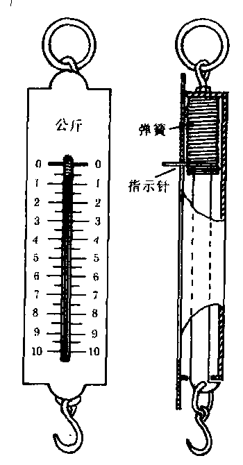 弹簧秤 物体发生弹性形变是有条件的,作用在物体上的外力越大,形变就越大。但如果外力过大,超过了一定限度,物体就不能恢复原状,这个限度叫做弹性限度。在弹性限度内,弹性力的大小和物体的形变成正比关系,但比例系数与物体材料的性质有关。对弹簧而言,在弹性限度内,弹性力f与弹簧的伸长量或压缩量X成正比,即f=kx,式中k是一个与弹簧的材料性质和形状有关的比例系数,称做弹簧的倔强系数。弹簧秤就是利用弹簧在力的作用下所产生的弹性形变来量度力的大小的。(如下图所示) |