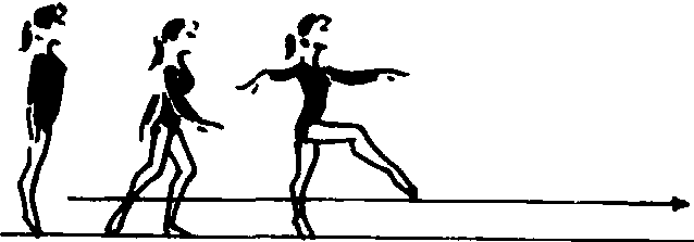 ❸弹簧步跳:支撑腿经稍屈膝用力蹬地,使身体向前上方腾起, 摆动腿迅速举膝前摆。