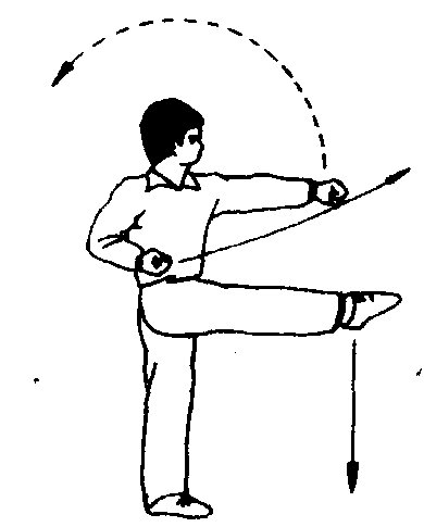 步型拳动作之二。为冲左拳同时弹踢右腿的动作。教学重点 参见弹腿冲拳。
