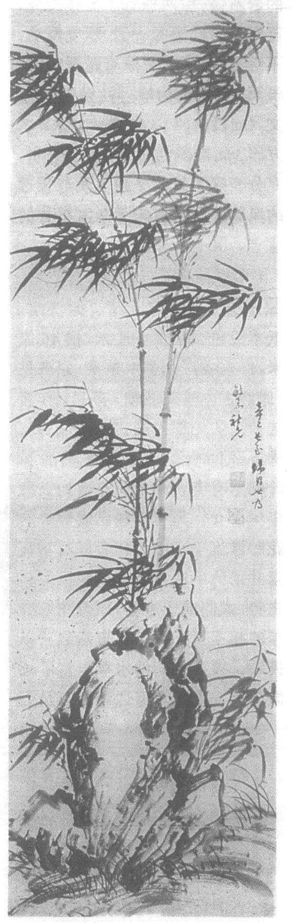 | 释义 | 归昌世风竹图轴明崇祯十四年(公元1641年)。归昌世绘。纸本水墨。纵146.2厘米,横44.7厘米。广东省广州美术馆藏。归昌世(公元1574—1645年),字文休,号假庵,江苏昆山人,移居常州。崇祯末以待诏征,不应。十岁能诗,发愤为古文。书法晋、唐,善草书,兼工印篆。擅写兰竹,在青滕、白阳(即徐渭和陈淳)之间。山水学倪瓒,黄公望。与李流芳、王志坚并称三才子。著有《假庵集》。此幅为他的晚年之作:芳草、丛竹簇围着一清瘦秀逸的岩石。石后两株竹子挺拔俊秀,茂密的竹叶倾向一侧,飘曳舞动,不胜风势。画面空隙有题署“辛巳长至,归昌世为敏□社兄”。钤白文〈归昌世印〉、朱文〈文休〉二方印。此幅墨色酣畅,用笔爽利,充分表现了竹的坚强气质与雅逸的风韵。既含有宋元画家墨竹的意志,又有所创新。