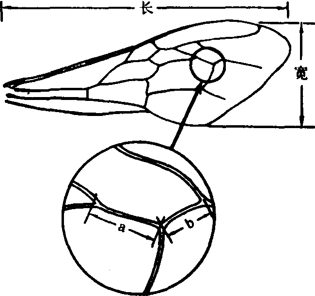 图2 前翅的测量和肘脉指数鉴定部位 肘脉指数 取全部工蜂的右前翅,将其置于载玻片上,在显微镜下用测微尺测量反曲翅脉,将第3肘室下缘分割成的a、b两段的长度,并按a/b算出肘脉指数的值。(图2) 第3腹节背板长度 取全部工蜂的第3腹节背板,置于载玻片上,在显微镜下用测微尺进行测量。(图3)
