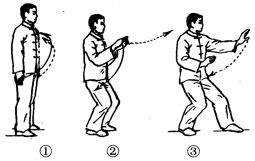 ❸成三体式时要“手脚齐到”。另外,还有一种形意拳的起势动作,是由准备姿势开始,双腿屈膝下蹲,同时双掌在体前由外向内划弧至腹前成掌心向下,随即双掌外旋逐渐握拳至双拳心向上,左拳不动,右拳小臂外旋经胸前向前钻出,然后上左步,左拳变掌劈出成三体式。
