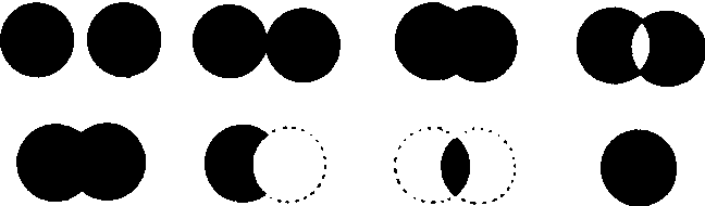 在平面构成中运用两个或更多的基本形,在形与形之间会产生某种结合关系,有多种可能的遇合方式,产生不同的效果。可以呈现分离、接触、相切、覆叠、联合、透叠、减缺、差叠、重合等多种不同的相遇关系。