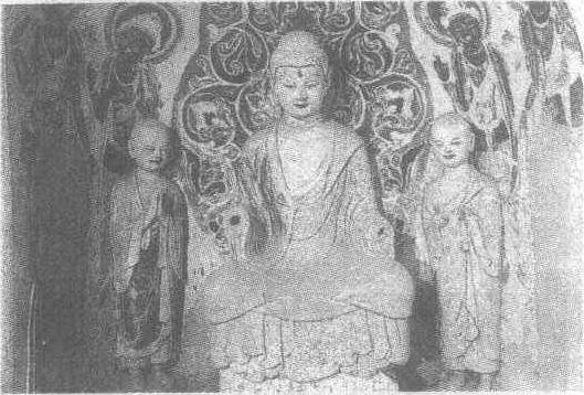 彩塑一铺初唐。高110厘米。甘肃省敦煌县莫高窟第283窟西龛。佛呈结跏趺坐式,袈裟的下摆似帷幕样覆于束腰方座,衣褶厚重自然。形体健美强壮,肌肤莹润,五官纤秀,目微向下视,面露慈祥,气质高雅,已一改前代威严的形象。左右两侧各立一弟子,身体线条圆润,面相年轻,甚至略带稚气,单纯而质朴,惹人喜爱。此龛造像色调鲜明,宗教神秘感较弱,更趋于世俗化写实。