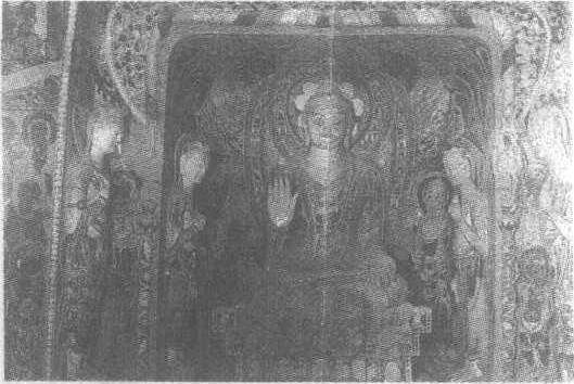 | 释义 | 彩塑一铺隋。高313厘米。甘肃省敦煌县莫高窟第420窟西龛。西龛为内外层方口龛,龛内塑一坐佛,二弟子,四菩萨。佛有磨光高髻,呈结跏趺坐式。右手举至胸前,掌心向外作施无畏印,左手作与愿印,身后绘火焰纹背光。左侧弟子迦叶饱经风霜;右侧的阿难初出茅庐,英俊而潇洒。两旁的胁侍菩萨温文尔雅,端庄秀丽。塑像后各绘六弟子和六菩萨。龛西壁两侧浮塑龙首龛梁、莲花龛柱。外层两侧各塑一菩萨,上画飞天和菩萨,整个净土说法场面气势宏大,满龛的雕塑和绘画使场面的纵深感很强。整龛作品色彩丰富,塑像白色的肌肤,青、绿、土红色的运用,使作品显得富丽、灿烂。