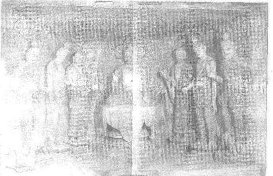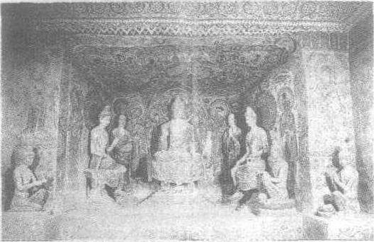 彩塑一铺盛唐。龛高192厘米。甘肃省敦煌县莫高窟第45窟西龛佛坛。此龛塑像原有九身,其中两身力士已毁。释迦牟尼居中呈结跏趺坐,神情沉静、温和,具大慈大悲的气度。两旁立弟子阿难和迦叶。阿难为年轻僧侣形象,抄手而立,一副恭听之态,迦叶额宽颐方,浓眉紧锁,俯首凝视。其形象具有老年人特征,但未因年老而掩没其足智多谋。两侧的菩萨站姿优美,神情妩媚动人,具有很强的写实性。外侧的天王形象为一武将,通身着铠甲,一手插腰,一手挥拳,威风凛凛。整铺造像人物身分、神态和性格各异,有松有驰,刚柔并具,对比强烈,是莫高窟两千多身造像中的精品。此外,造像身后和龛位还绘有飞天、菩萨、天龙八部等形象,使净土说法的场面更加充实和完整。此铺是建筑、雕塑和绘画集为一体的佳作。