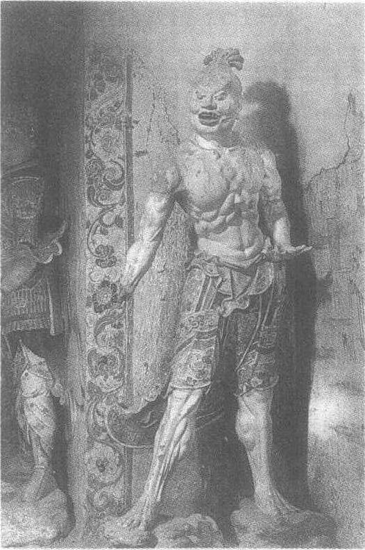 | 释义 | 彩塑力士像盛唐。高146厘米。甘肃省敦煌县莫高窟第194窟西龛外北侧。力士塑像是“力”的象征。前额突出,双目暴凸,面颊肌肉紧绷。身体各部的比例适宜,胸、腹、臂、腿的一块块肌肉隆起,青筋毕露。脚踏须弥山,右手挥拳(已残),左手至腰部平舒,所有这一切无不显示其体内所蕴藏的巨大力量,同时也表达出豪爽和豁达的性格。腰系短裙,上有精细的卷云纹等彩绘。短裙随风飘舞,线条流畅自然,与力士塑像的风格十分协调,不失为一件优秀作品。