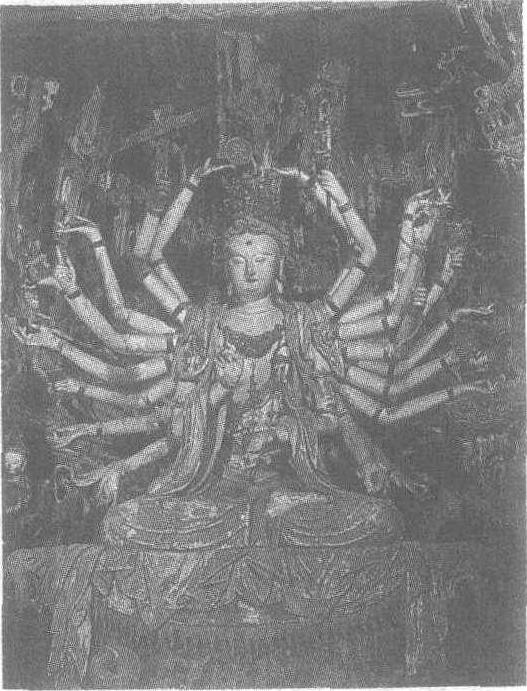 | 释义 | 彩塑千手观音像明。通高345厘米。山西省平遥县双林寺内塑像。该寺在平遥县城西南7公里的桥头村北侧。北齐武平二年(公元571年)始建中都寺,宋代重修后改名为双林寺。现有的规模和建筑、塑像均为明代建造。千手观音是大雄宝殿西侧西庑的主尊。菩萨端坐于宝座之上,头戴龛形宝冠,上满缀珠宝,胸佩璎珞,饰带自然下垂。丰满的腰间系一红裙。面庞端正秀丽,慈眉善目,一副净化肃穆之态。造像为26臂,均戴宝钏,各有所事。有数百尊悬塑菩萨为衬托,气势宏大,为明代千手观音的代表作。