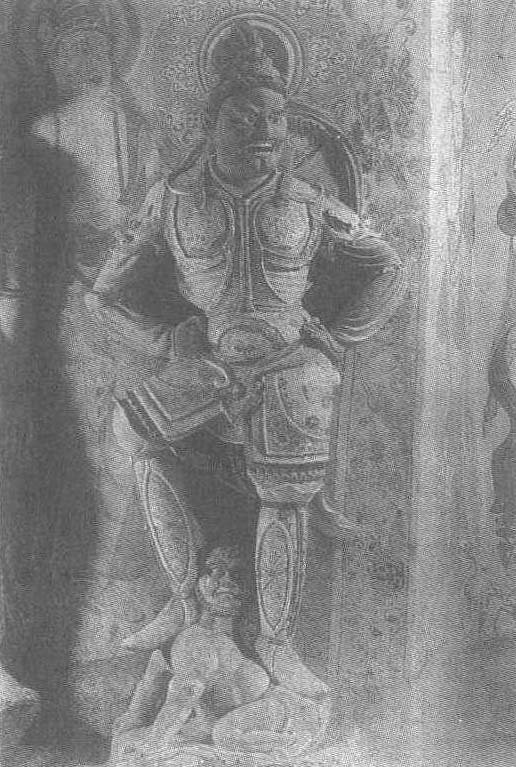 | 释义 | 彩塑天王像盛唐。167厘米。甘肃省敦煌县莫高窟第46窟西龛内北侧。石窟造像中,护法天王多塑成武将的形象,只是面部及姿态较武将更为夸张。此天王身披铠甲,其上绘画精致。脚蹬战靴,眉头紧蹙,怒目圆睁,张口露齿似在呵叱。双手插腰,弓步横踏于地神的臀部及胸部,形象威武有力。脚下的地神卷发虬髯,双眼圆睁,唇角下耷,在天王的重压下表现出紧张和不堪重负。对比之下,益发衬托出天王的形象高大和勇武。