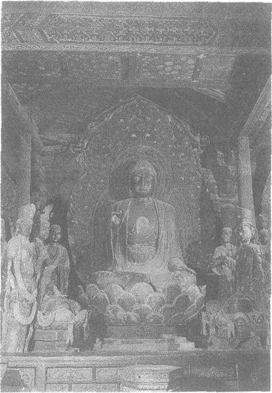 | 释义 | 彩塑神像群辽重熙七年(公元1038年)。佛像高5.38米。山西省大同市华严寺薄迦教藏殿内塑像。华严寺位于大同市西部,是辽、金时期著名的寺庙。该寺以佛教中的流派之一华严宗的经典《华严经》为依据而修建。部分建筑毁于兵火,后重建。明中叶分上下两寺,下寺以辽建薄迦教藏殿为主体建筑,是专门存放佛经的殿堂。内有辽代彩塑29尊,中央为三世佛(过去、现在、将来)。弟子和菩萨、供养童子环侍两侧。此群像为明间毗卢佛为主的一组塑像。佛端坐于莲花座上,莲瓣共四层,上有沥粉贴金佛像,佛结跏跌坐,身后有背光、饰网纹和火焰纹。袒胸,神情严肃而庄重。两旁弟子阿难和迦叶均清秀文静,貌露虔诚。胁侍菩萨或侍立,或坐于生灵座上,有的侧耳倾听,有的凝神思考,表情生动,神态各异。整个场面具有宗教的庄严性,每一塑像又各具人的个性,是辽塑中的代表作。