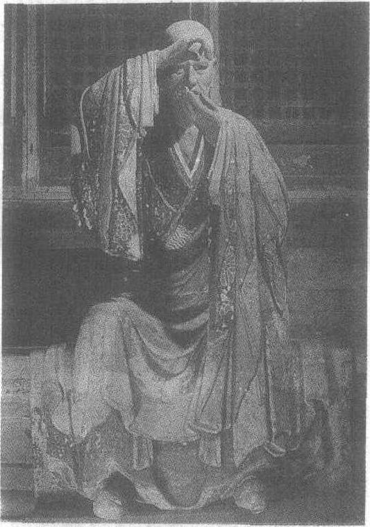 彩塑罗汉坐像北宋嘉祐年间(公元1056—1063年)。高152厘米。山东省长清县灵岩寺千佛殿。灵岩寺在长清县东南侧山下,建于北魏,盛于唐,文物、古迹众多。现存千佛殿为明代建筑,内有40尊罗汉及高僧像。专家对这批塑像的塑制年代意见不一,有认为是宋塑,有认为是明塑。80年代维修时得以查明,大部分为宋塑,仅有少量为明塑。此塑像为一汉僧,身材高大,右腿盘曲坐于台上,左手摊一香帕,右手拈起一物。眉头微蹙,双目凝于手指,神情极为专注。形貌似中青年,性格内向,面容冷峻,特点极为突出,酷似真人,塑造技艺极为高超。