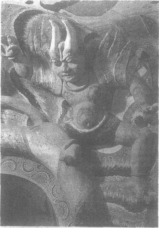 | 释义 | 彩塑羽人像北周。高59厘米。甘肃省敦煌县莫高窟第297窟西龛龛楣北侧塑像。羽人是中国神仙思想的产物,是古代神坛中的飞仙。在魏晋南北朝墓室及敦煌早期的壁画中,常以羽人为题材。莫高窟中高浮雕羽人仅此一件。羽人头生双角,人面,双目外凸,两耳却似兽耳。颈带粗项圈,肩有羽翼,双手如爪。身体粗壮,下着短裤,暴露于外的肌肤以赭红色晕染,使塑像的立体感增强。此雕塑将人的机智和禽兽的勇猛,灵活融汇为一体,形象极为生动,是莫高窟早期作品的代表作。