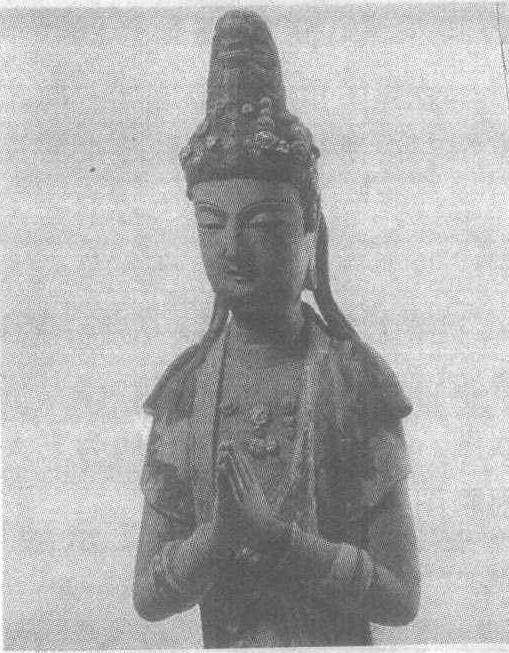 | 释义 | 彩塑菩萨立像辽重熙七年(公元1038年)。通高3.02米。山西省大同市华严寺薄迦教藏殿内塑像。这尊菩萨上身微裸,天衣绕肩飘然垂于脚下。头戴装饰精美的花冠,身佩塑造细腻的璎珞和臂钏,腰胯轻移,亭亭玉立。脸庞丰腴圆润,头微低,目下视,合十含笑,正沉入参禅悟道的虔诚之中。虽为神像,但其面貌和体态不失凡人少女的美丽和风韵。塑造技艺娴熟潇洒。塑像风格较唐代增加了轻盈和灵秀之美,更符合现代审美观。这尊拨动人们心弦,增添心灵圣洁感的塑像是华严寺中的名尊,也是辽代彩塑艺术的珍品。
