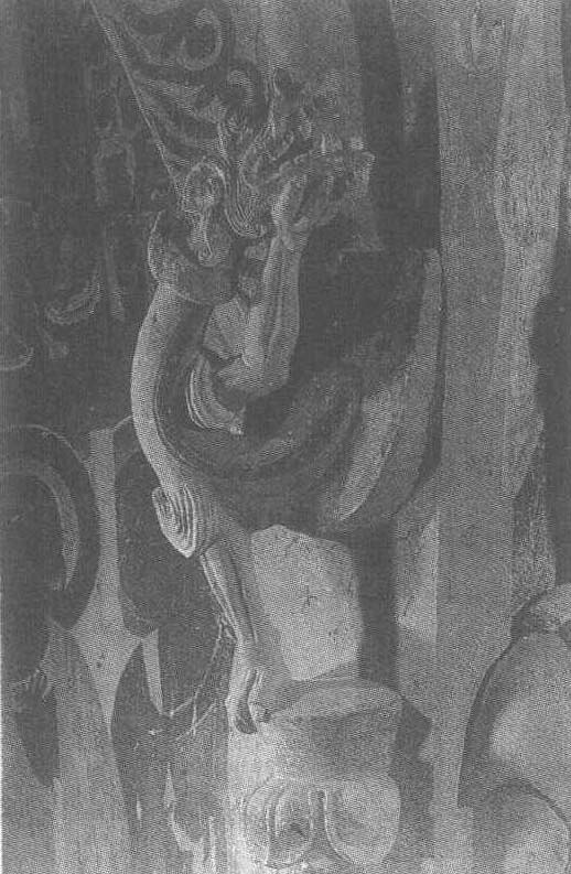 | 释义 | 彩塑龛梁龙饰隋。高59厘米。甘肃省敦煌县莫高窟第419窟西龛外南侧。北魏至隋唐,龙的形象作为一种装饰大量地出现于建筑之上。佛教把龙列为“天龙八部”之一。不同的时代,其形象有较大的变化。此龛梁龙饰,头、足及部分身躯采用了圆雕手法,一爪踏于莲座的边缘,抠抓得十分有力。另一爪高高翘起,有趣地托住下颌。张口露齿,造型颇为奇特。龙身的须毛先塑造出卷曲的形状,又用阴线刻画细部,富有装饰意味,在佛龛中起到点缀作用,使肃穆的宗教环境变得活泼而有生气。