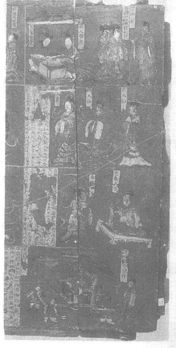 | 释义 | 彩绘人物故事漆屏风北魏延兴四年至太和八年(公元474—484年)。1965年山西省大同市石家寨司马金龙墓出土。大同市博物馆藏。保存较完整的屏风有5块,每块长约80厘米,宽约20厘米,厚约2.5厘米。其上两面均绘有帝王、将相、烈女、孝子、高人、逸士等故事图。内容源于汉代刘向《列女传》等书,主旨是宣传封建伦理。彩绘方法是在朱漆地上用墨线勾轮廓,再于其内填以黄、白、青、绿、橙红、灰蓝等色。每个故事旁均加有黄底黑字的题记和榜题。此画继承了战国漆画和东汉漆画的传统,采用色彩渲染及铁线描的手法,画面绚丽多彩,线条流利,文字点画方劲,已经近于楷书,是少见的北魏墨迹。北魏髹漆器所见甚少,这批漆屏风的出土,为书法、绘画及漆工史研究提供了重要的实物资料。