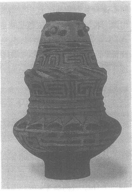 彩绘双腹陶罐夏家店下层文化陶器。1974年内蒙古自治区敖汉旗大甸子早期青铜文化墓地出土。现藏辽宁省博物馆。高21.2、下腹径18.5厘米。上下双腹如葫芦形,假圈足,口颈处饰四乳突,上腹堆贴贝纹,腰饰三道凸弦纹,造型奇特。泥质灰陶为胎,在研磨后的器表以黑色为地,绘朱黄二彩花纹,颈及双腹饰回纹三道,间以叶蔓纹。黑、红、黄三色相间,显得花色繁丽富于变化。此器亦称“塔式瓶”,在数百座墓葬中,仅此一件,甚为珍贵,当为殉葬的一种特制礼器。 |