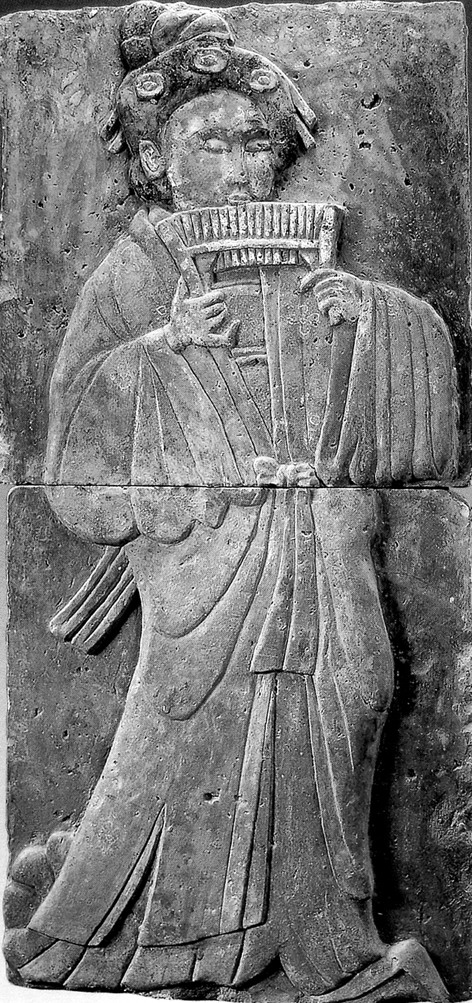 1992年彬县底店乡前家嘴村五代冯晖墓出土。由2块砖雕上下拼成1幅完整人物,镶嵌于墓室甬道西壁。人物高0.74米,姿势、衣着、体形与女觱篥浮雕砖第二幅人物相似,但不如前者矮胖。双手举十七管排箫吹奏。现藏彬县文化馆。