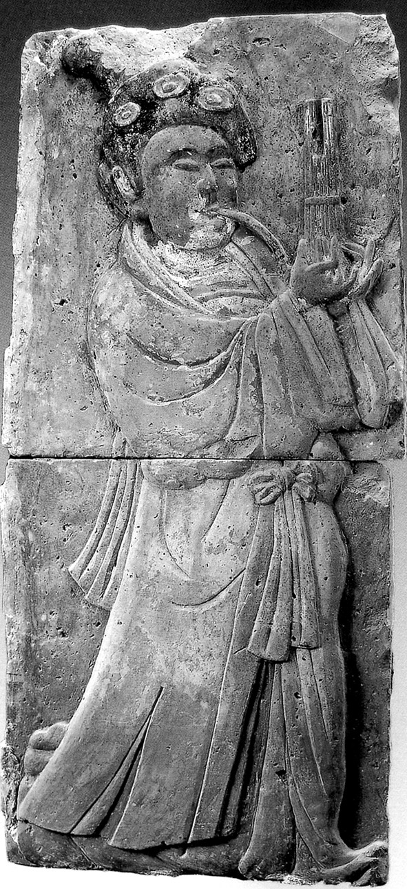 | 释义 | 彩绘女芦笙浮雕砖cɑihuinü lushenɡ fudiɑozhuɑn1992年彬县底店乡前家嘴村五代冯晖墓出土。由2块砖雕上下拼成1幅完整人物,镶嵌于墓室甬道西壁。人物高0.74米,头饰抱面高髻,戴花三朵,高髻上部残,衣着、姿势与女觱篥浮雕砖第一幅人物相似,区别在于演奏的乐器为芦笙。另外颈上还有项圈三周。演奏者面容宽大,体形壮硕、矮胖,明显区别于其他浮雕形象。现藏彬县文化馆。
