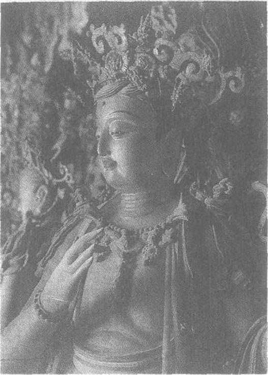 | 释义 | 彩绘悬塑胁侍菩萨像明。通高210厘米。山西省隰县小西天庵内塑像。小西天庵在隰县城西凤凰山巅,始建于明崇祯七年(公元1634年)。庵分上下两院,上院正中为大雄宝殿,面阔五间,五尊主佛端坐中间,悬塑满布,造型生动,金碧辉煌。此为十尊胁侍菩萨之一,为一妙龄女性形象。头戴珠翠额子花冠,胸佩宝石璎珞,袒胸,肩有披巾,飘带缠腕自然下垂,下着长裙,衣着头饰均极考究。塑像肌丰肤细,嘴微噘,双目凝视含情,柔媚之态极为动人,富有浓郁的生活气息。明朝末期,我国的宗教艺术急剧衰退,人物塑像流于脸谱化,呆板无神,千篇一律。但小西天塑像却不流于一般,其雕塑技艺高超,风格细腻富于变化,是明末彩塑中的优秀代表。