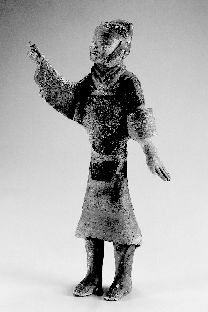 | 释义 | 彩绘指挥俑cɑihui zhihuiyonɡ西汉陶俑。1965年咸阳市红旗公社(今咸阳市渭城区正阳镇)杨家湾汉墓出土。高55厘米。头戴武弁,下有结带。身穿白、红镶边绿色战袍,外披黑色鱼鳞甲衣,腰系带,足登彩绘高靿靴。右手上举与前额齐,食指和大拇指伸出作指挥状,左臂偏外下垂,手平伸,姿态和服饰与其他俑不同,是一指挥官形象。此俑仅出1件,非常珍贵。现藏咸阳博物馆。