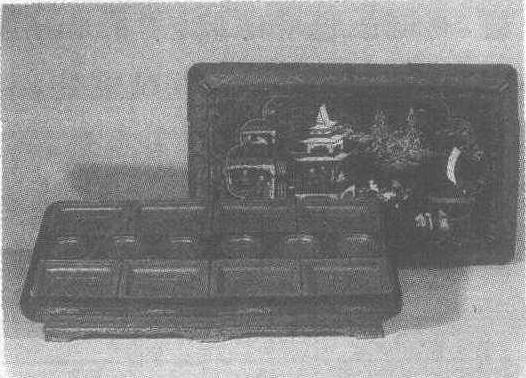 | 释义 | 彩绘描金楼阁人物长方形漆盒明晚期。长50.3厘米,宽31厘米,通高11.3厘米。安徽省博物馆藏。木框蔑胎。委角长方形,下有圈带足,足边缘雕刻成波浪式花边。髹黑漆地,盒壁自圈带足向上用描金法饰以花卉、回纹、菱形锦纹、夔龙纹等纹饰。盒盖上面描一花形开光。开光外饰相间的夔龙、卷云纹;内用金、褐、蓝、灰、红、白等色绘古刹流云、山峦宝塔、落帆归舟及人物等构成的景物图;四角描“卍”字形锦纹。盒内放置八个等大的长方形小碟,三件等大的长方形双圆座茶托。均为薄木胎,表黑里红,并饰描金花纹作装饰。此盒构造灵巧,纹饰秀美华丽,虽为实用器而给人以美的享受。