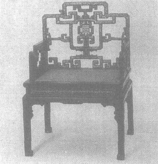 | 释义 | 彩绘描金紫檀扶手椅清雍正至乾隆(公元1723—1796)年间。长67厘米,深57厘米,高103厘米。北京故宫博物院藏。椅背呈“凸”形轮廓,扶手凹凸起伏落下,束腰,直腿上带卷云翅,内翻马蹄足,委角牙子,椅背和扶手由短木攒成或透雕成拐子纹,疏落有致。椅背框和束腰正面髹黑漆,上用描金的方法饰以卷草、菊花、杂宝、蝙蝠及“卍”字形等纹饰,富丽堂皇,极为精致。