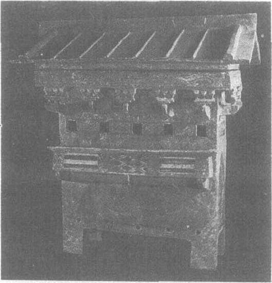 | 释义 | 彩绘收租场面陶仓楼东汉。高70厘米,面阔52厘米,进深20厘米。1963年河南省密县后士郭1号汉墓出土。河南省博物馆藏。陶楼为灰陶所制,共两层,楼顶为单檐悬山式。顶坡有垂脊,瓦垅。檐下有枋,枋下承以斗拱。楼身彩绘出明窗、栏杆、平座、楼梯。可看出这是一座仿木结构的陶制明器。仓楼四壁以黑、红、赭三色绘画。正面为收租图。主人端坐于方席上,作伸手接物状。他面前的一人双腿而跪,面前置绢,双手捧旗,作奉献状。左侧有二人,一位手撑粮袋,一位正向袋中倒粮。这组人物的周围绘有粮堆,装满粮食的粮袋,斗、斛等。作者以简练的笔法形象地概括了农夫交租的情形。仓楼的背面绘饲马图。一棵繁茂的大树干上系一匹体态健壮的骏马,它正安闲地咀嚼着篮中的草料。其身后有马夫一名,但已残缺不清。画面的上方有四只鸿雁,它们在引颈飞往远处的密林。整个画面一派郊野风光,既有浓厚的生活情趣,又展现出大自然的美好意境。仓楼的两侧壁绘佩剑而立的武士。