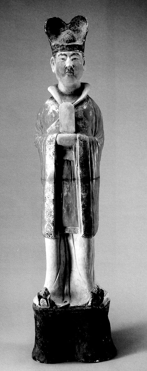 | 释义 | 彩绘文官俑cɑihui wenɡuɑnyonɡ唐代陶俑。1971年礼泉县唐越王李贞墓出土。通高114厘米,头戴黑底色饰淡蓝色花纹高山冠,窄眉,细眼,朱唇,面容清秀。内穿绿色圆领窄袖襦,外着红色高领交衽阔袖衫,束腰,淡蓝色饰花纹襟袖沿并贴金,下着白色裳,足着黑底色饰淡蓝花纹高头如意履,双手执璋於胸前,恭立于黑色高抬座上。造型生动。现藏昭陵博物馆。
