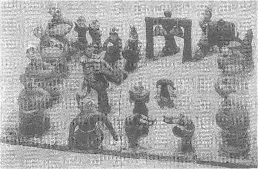| 释义 | 彩绘杂技陶俑盘西汉。高22厘米,长67.5厘米,宽47.5厘米。1969年山东省济南市无影山1号西汉墓出土。山东省济南市博物馆藏。在长方形陶底盘上共有12人(出土时缺一人),后侧是乐队,有的吹笙,有的抚瑟,引人注目的地方还有敲钟者和击鼓者。陶底盘的中部有四位柔术表演者,有的倒立,有的折腰。其旁一男俑和一女俑展臂扭腰,翩翩起舞。两侧分立着七位观众,皆拱手而立。奏乐者严肃认真;舞蹈者、演杂技者面带笑容;观赏者其乐融融。整个场面热烈、欢快。陶塑风格质朴简练。色彩醒目但不失柔和,为研究我国古代杂技表演艺术提供了珍贵的资料。