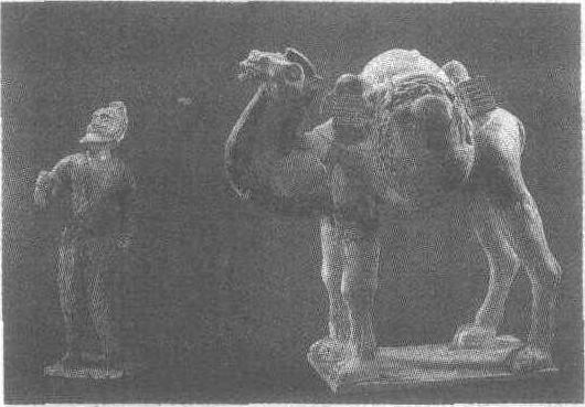 | 释义 | 彩绘牵驼陶俑唐。驼高43厘米,俑高36厘米。1972年陕西省礼泉县郑仁泰墓出土。陕西省博物馆藏。此驼肢体粗壮,筋骨铮铮,四蹄的塑造更显出骆驼的稳健有力。驼曲颈仰首,双目圆睁,作嘶鸣状。驼峰两侧放置载物架,架上驮皮囊,上彩绘流云纹。皮囊具有膨松而柔软的质感,暗示内装细软之物。皮囊的后面爬着一只灵巧的小猴,为漫漫的旅途增添了乐趣。牵驼俑深目、高鼻、长髯、身着翻领衫,为西域胡人的形象。他昂首视向前方,手作牵缰状。这组反映唐代东西经济交流的牵驼俑,再现了当时丝绸之路商旅的艰辛跋涉,以及“沙漠之舟”立下的功绩。