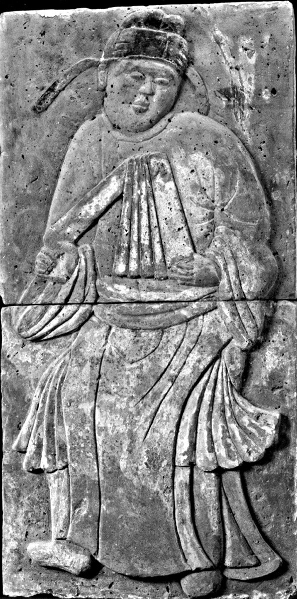 | 释义 | 彩绘男拍板浮雕砖cɑihuinɑn pɑibɑn fudiɑozhuɑn1992年彬县底店乡前家嘴村五代冯晖墓出土。由2块砖雕上下拼成1幅完整人物像,镶嵌于墓室甬道东壁。人物高0.72米,头戴黑色软脚幞头,身着红色圆领袍服,束红色腰带,双腿微弓,腰身前倾,双目左下视,双手执六片组拍板,正在演奏。神态自然,作专心演奏状。现藏彬县文化馆。