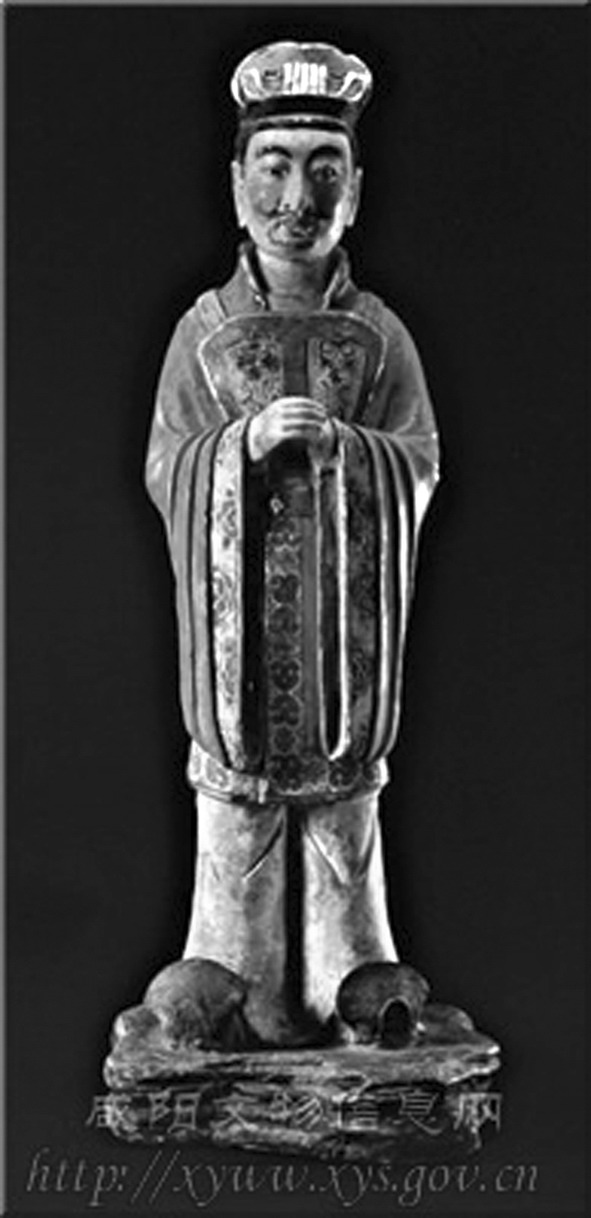 | 释义 | 彩绘贴金文官俑cɑihui tiejinwenɡuɑnyonɡ唐代陶俑。1971年礼泉县烟霞公社(今烟霞镇)马寨村张士贵墓出土。显庆二年(657)葬。2件。俑高68.5厘米。头戴梁冠,穿红色阔袖长衫,披饰花裆,着乳白色裳,脚穿黑色高头履,衬缘、袖口、襟边饰花纹,衣、冠边缘均贴金。浓眉高鼻,八字胡上翘,面目儒雅清俊。现分藏昭陵博物馆、陕西历史博物馆。