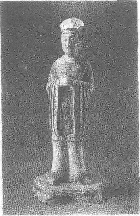 | 释义 | 彩绘釉陶文吏俑唐。通高69厘米。1972年陕西省礼泉县郑仁泰墓出土。陕西省博物馆藏。俑五官端正,目光镇定,神态从容,温文尔雅,分脚稳立于石上。头戴梁冠,身着彩绘勾边红色官服,外套彩色裆(裆为北方民族服饰,形似今日背心,肩部用皮制褡袢联缀,腰间用皮带系扎)。脚登黑色翘头靴,双手拱于胸前。此俑不仅再现了唐朝廷文官的生动形象,也为研究唐早期的雕塑艺术提供了很好的实物资料。