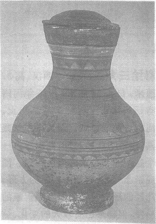 彩绘陶壶❶汉代。1975年大连市新金县花儿山乡贝墓出土,口径18、腹径33、底径17.5、通高38厘米。泥质灰陶,轮制。侈口小卷沿。束劲。鼓腹。圈足。上有盖,盖上用红、白彩绘云气纹。口沿下用红彩绘棱形几何纹图案。颈部至腹部与上盖相同,用红、白彩绘几何纹。现藏旅顺博物馆。