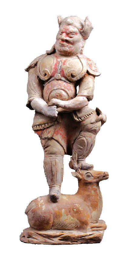| 释义 | 彩绘陶天王俑陶器。国家一级文物。永安寺舍利塔地宫内出土。一尊高 64 厘米,一尊高 54 厘米。陶俑头束高髻,深目高鼻,双目圆睁,怒视前方,身穿金甲,腰系红色战袍,腿裹行藤,脚蹬毡靴,身材比例恰当,肌肉发达、健美,显示了武士的无穷力量。天王身材魁梧,右手握一兵器(缺)、左手作“施无畏”印,两足踏在恶鬼身上,恶鬼头长独角,两臂肘撑地仰卧,张口哀号,神情惊恐万分。1992 年,赴日展出。现藏天水市博物馆。