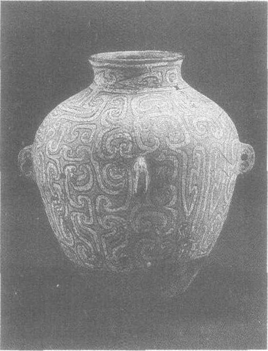 约公元前1500年。通高30厘米,口径11.5厘米。内蒙古自治区赤峰市出土。北京中国社会科学院考古研究所藏。陶罐侈口,短颈,丰肩,长腹,平底,腹部有对称的四系。从罐口至近底处施彩绘,为红、黑、白彩绘连续的云纹。整件器物造型沉稳,彩绘细腻流畅,富有装饰性。色彩鲜艳明丽,具有显著的地方特色。